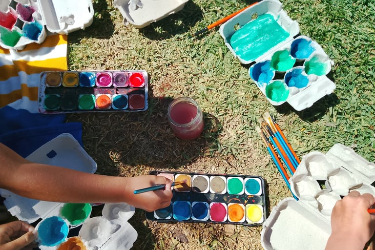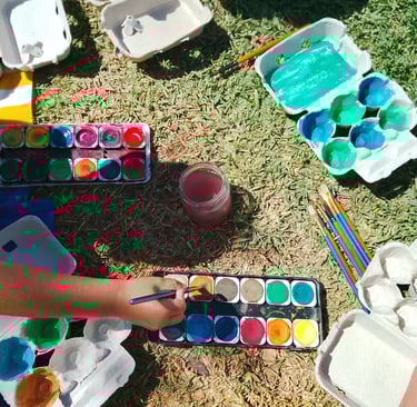 Durante esta Oficina estamos a trabalhar vários elementos, desde a reutilização de materiais ao contato com a Natureza. Temos a variante de aproveitar a caixa de ovos, colorir com aguarelas e um toque de purpurinas e utilizá-la como baú de tesouros que vamos encontrando num passeio pelo parque ou jardim...uma folhinha, um ramos de alecrim, uma pedrinha, uma pena...